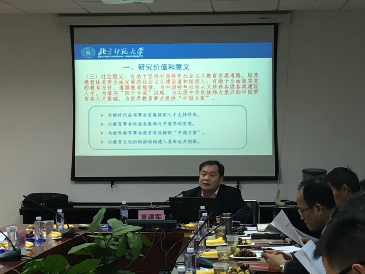 知名学者清华大学文科资深教授吴潜涛先生担任评议专家组组长,教育部社科中心主任王炳林教授、中国教育电视台原党委书记张剑研究员、《光明日报》总编室副主任李亚彬博士、山西财经大学党委副书记顾昭明教授、《马克思主义研究》副主编汪世锦研究员、《政治学言》副主编兼编辑部主任王炳权研究员、《中国高等教育》总编辑唐景莉博士、中国人民大学教育学院副院长周光礼教授、武汉大学教育科学研究院副院长刘亚敏教授、教育部长江青年学者及188BET金宝搏官网教育学部周海涛教授、教育部长江青年学者188BET金宝搏官网教育学部薛二勇教授作为评议专家组成员与会。北京市习近平新时代中国特色社会主义思想研究中心干部安然同志出席会议。课题组主要成员孙秀民教授、马振清教授、冯留建教授、徐斌教授、尚九玉副教授、杨增岽副教授、吴林龙讲师、刘进伟讲师、梁宇博士列席论证会,大家认真聆听了专家意见和建议。